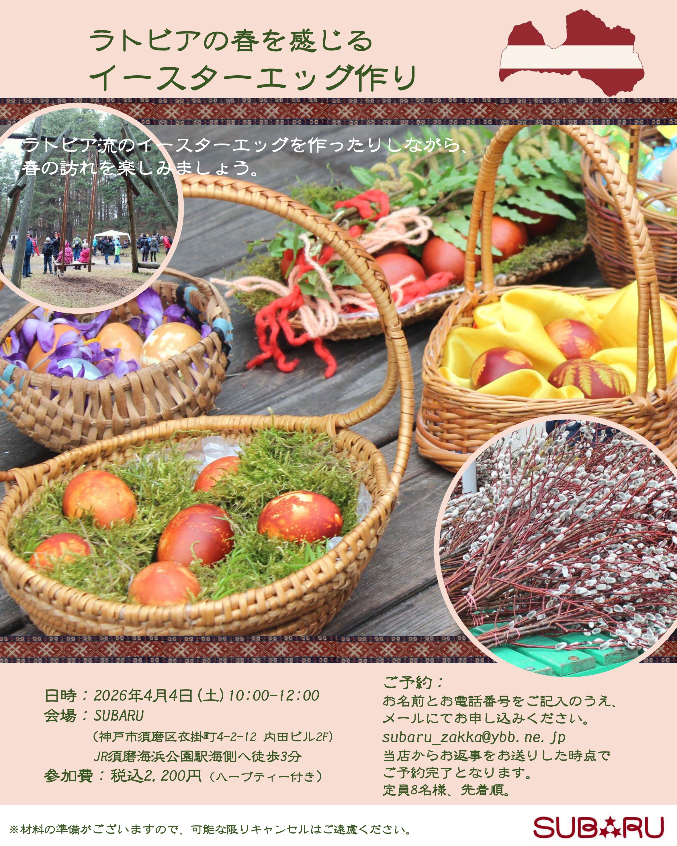 日程:2026年4月4日(土)10:00-12:00 | ラトビアでは春分祭やイースターで、イースターエッグを作ってお祝いします。当日は2種類の卵を使って、ラトビア流のイースターエッグを作ります。ほかにもラトビアならではのアイテムが登場するかも?ラトビアの春についてお話ししながら楽しいひとときを過ごしましょう! 参加費:税込2,200円(ハーブティー付き) ご予約:メール(subaru_zakka@ybb.ne.jp宛て)でお申し込みください。お名前とお電話番号をお知らせください。当店からお返事をお送りした時点でご予約完了となります。各回定員8名様、先着順。 ※材料の準備がございますので、可能な限りキャンセルはご遠慮ください。 |