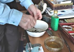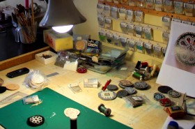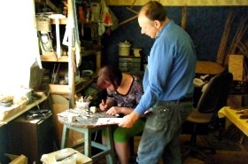 | 首都リガ市の郊外にある御自宅で銅製アクセサリーの制作に励むドゥアナーツさん。民族衣装の装飾品を見ると分かるようにラトビア人は古くからアクセサリーにこだわりがあり、ドゥアナーツさんの作品はその系譜を受け継いでいます。 |