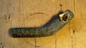 | 自宅兼工房には原木がごろごろ。この写真の木の右側に開けられた穴は何の為のものでしょうか? | |||||||||