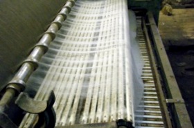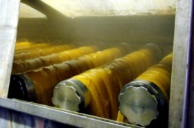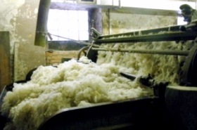 大量の羊毛が機械に乗ってどんぶらこ〜。 |