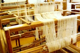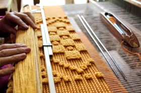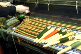 | 何がどうなってるのか分からない複雑さですが、熟練の女性職人さん達の手で素敵な織物に変身していきます。 | |||||||||