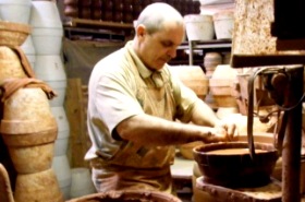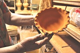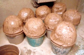 | 先に作ってある型を使って器の形が作られます。周囲の植木鉢のようなものが型です。 創作的な部分はロクロを使っての別作業となります。 |