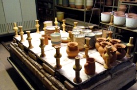 | 左上に見えているのが窯です。レールの上に台が載っているので、このままの状態で窯に入ります。10時間ずつ2度焼きされています。焼き上がり後に検品の末、A級品だけが選り分けられます。 ラトビアのあちらこちらで見かけるこのバイダバ村の陶器、駐日ラトビア共和国大使館でも使用されています。 |