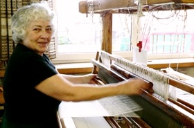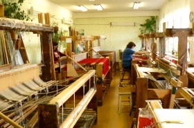 | 大きな機織り機がずらりと並ぶ圧巻の作業部屋。 昔ながらの織機を使い丁寧に少しずつ織り上げていきます。 |