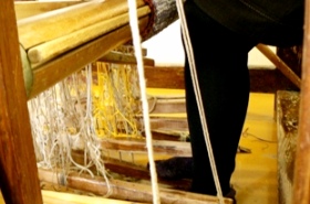 | このようにこの工房では全ての工程が手作業で行われています。私も体験させてもらいましたが、複雑な力仕事にアップアップでした。 美しく丁寧に織り上げられたストールは丈夫で末永くお使いいただけます。 |
