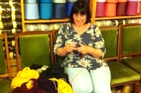 私が打合せをしていた時にやってきた編み手さんの一人。 それぞれの編み手さんに相応しい図案と毛糸が渡され、それぞれの自宅や工房で丁寧に手編みされています。こうして出来た作品は編み目が細かくて美しく、保温性に優れています。 |