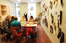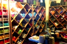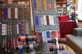 奥のアトリエでは目移りする品揃えの毛糸も販売しており、地元のニッターさんの御用達となっています。 このアトリエで、デザイナーも務めるオーナーが新しいデザインを生み出したり、資料を片手に伝統的なデザインを復刻させたりしています。 |