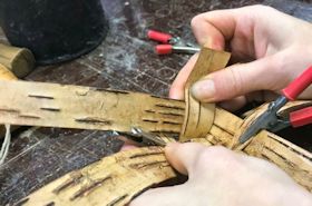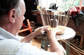 | こうして木部にバスケットが編み上げられていきます。二つとして同じもののないとっても格好良い作品たちです。 |