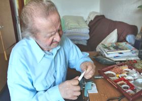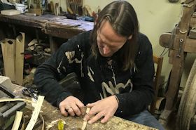 熟練の職人、ヤーゼプスさん。最終段階では様々な手法で飾り付けを施していきます。 |