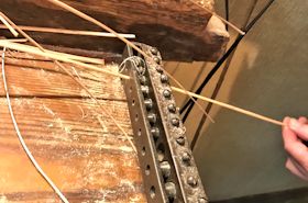 | 糸を束ねるのももちろん手仕事。とっても巨大な糸巻き機です! | |||||||||